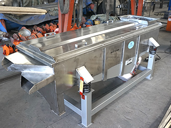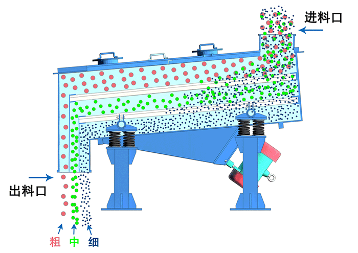 直線篩依靠兩個相同頻率的反向電機使物料在篩面上直線向前跳躍,小于篩孔孔徑的物料通過篩網落入下層,將原本雜亂無章的顆粒分離,即按粒度分層,形成底部小顆粒、頂部粗顆粒的排列,從而達到對物料進行篩分和分級的目的